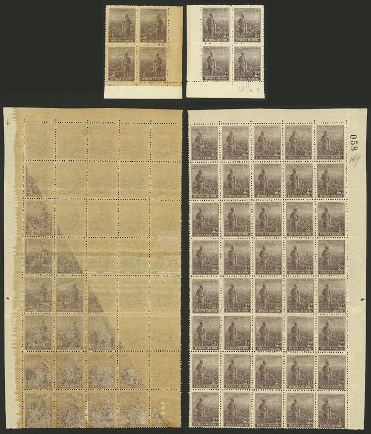 1911 2c. Plowman, corner block of 4 + block of 40 with complete and partial offset impression on back, VF quality! (Image)