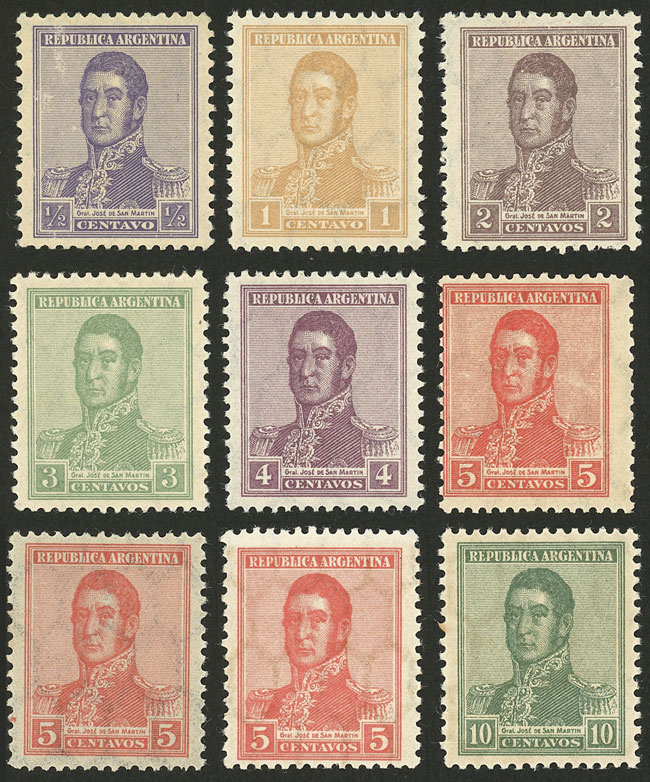 GJ.423/429 + 428a + 428b, 1917 San Martín with vertical honeycomb watermark, complete set with perf 13½ x 12½ including the very thin paper and thick papers of 5c., several MNH (+50%), excellent! (Image)