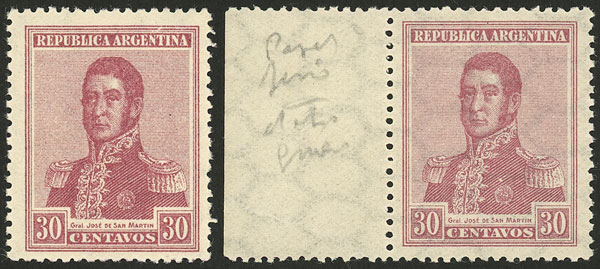 + 450b, 1917 30c. San Martín printed on THICK and THIN TRANSPARENT PAPER, both MNH (+50%), superb! (Image)