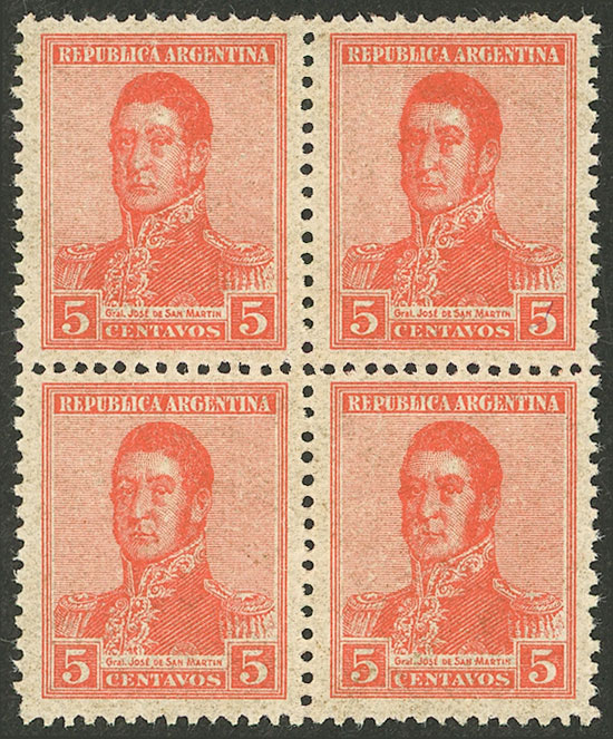 1918 5c. San Martín, block of 4 printed on VERY THIN PAPER, VF quality! (Image)