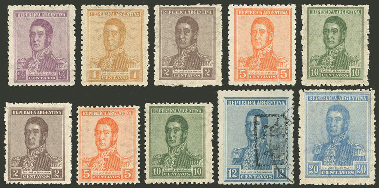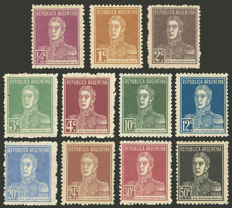 GJ.574/585 (without 579), 1923 San Martín with period and perforation 13½, 11 of the first 12 values (without the 5c.), VF quality! (Image)