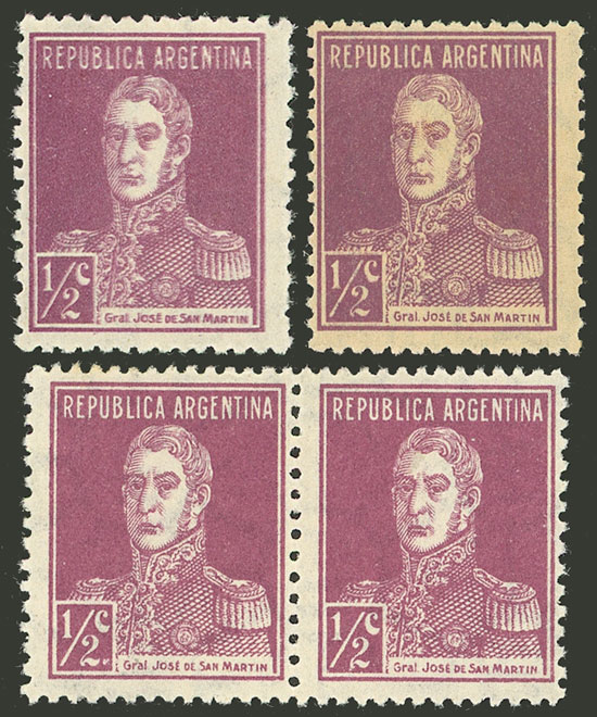 + 594c + 594e, 1924 ½c. San Martín with varieties: Double impression, pair with and without period, and 8mm sun watermark, VF (Image)