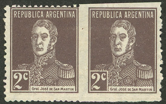 GJ.596PV, 1924 2c. San Martín, pair IMPERFORATE VERTICALLY, VF quality! (Image)