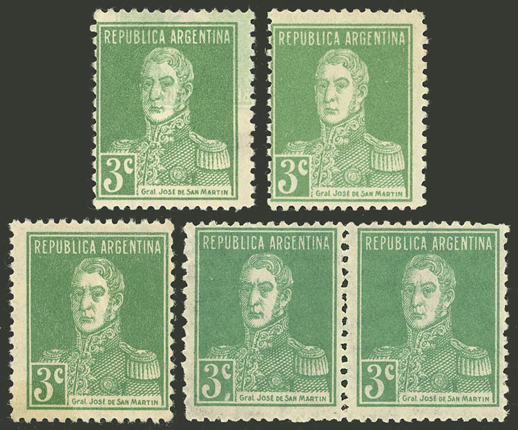 + 597b + 597c + 597d, 1924 3c. San Martín with varieties: Double impression (one light and very shifted), invisible watermark, pair with and without period, and 8mm sun watermark, VF quality (Image)
