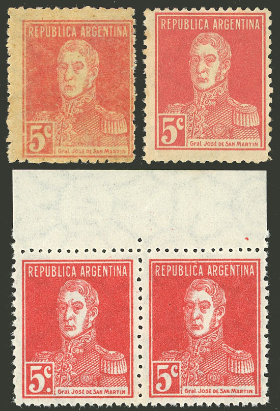+ 599d + 599e, 1924 5c. San Martín with varieties: printed on gum, pair with and without period, and 8mm sun watermark, VF quality! (Image)