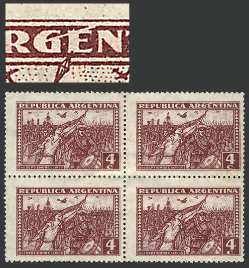 4c. Revolution of 6 September 1930, block of 4, one with variety: White line across the 'G' and 'E' in ARGENTINA, no gum (Image)