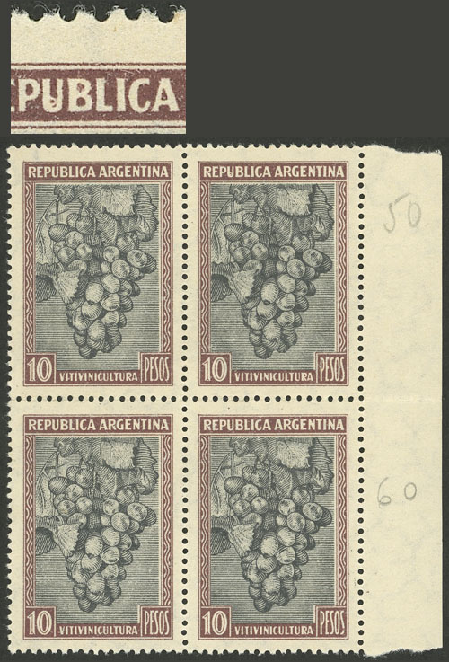10P. Grapes, rose-chestnut and black, block of 4, one with variety: "U" of REPUBLICA defective, with sheet margin, VF (Image)