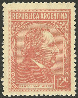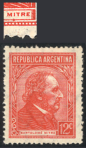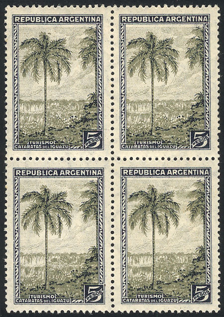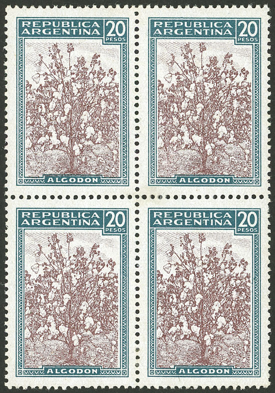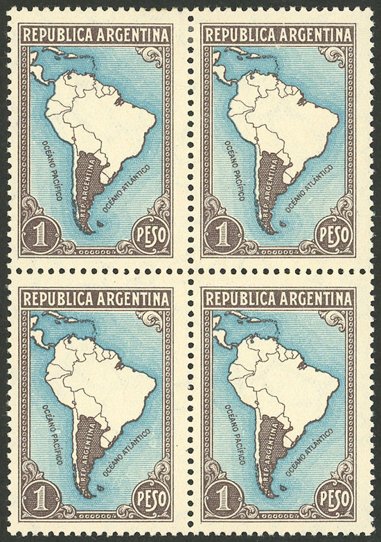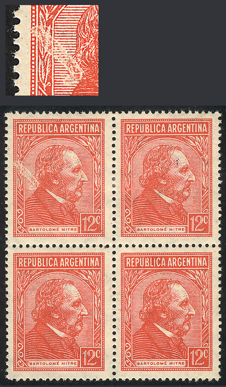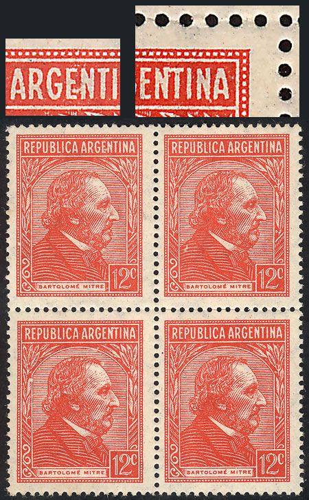 12c. Mitre, block of 4, 2 with varieties: "N" and "T" in "ARGENTINA" joined, and white line between the "E" and "N" in "ARGENTINA", VF quality (Image)
