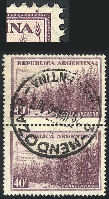 40c. Sugar cane, pair, the top stamp with variety: The flower extends over the frame, used, VF quality (Image)