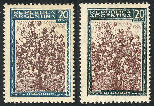 765A, 20P. Cotton, round sun wmk, in green-blue and chestnut, and blue-green and chestnut, VF quality (Image)