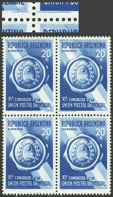 + 825d, UPU Congress, block of 4, top stamps with variety: Thin color line in bottom border, VF (Image)