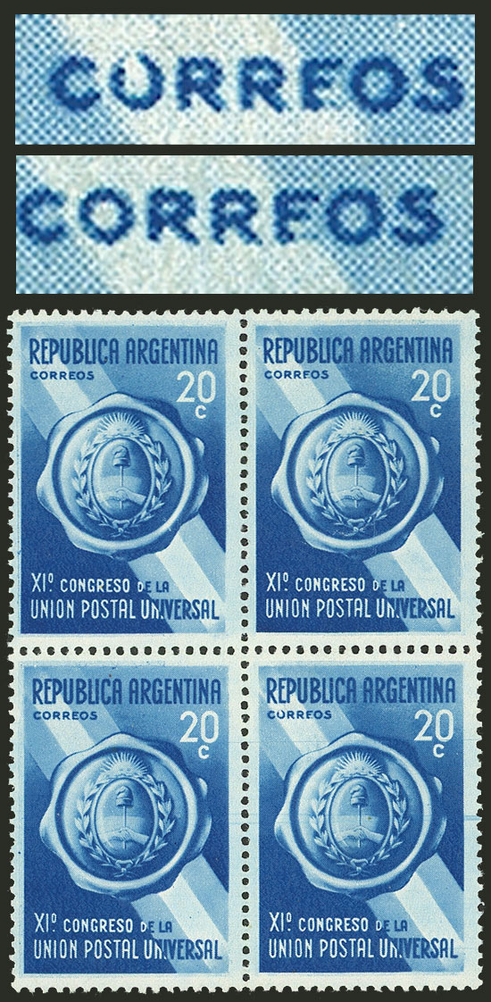 + 825b, 20c. UPU Congress, block of 4, one with "CURRFOS" variety (MNH) and another one with "CORRFOS" variety, VF (Image)