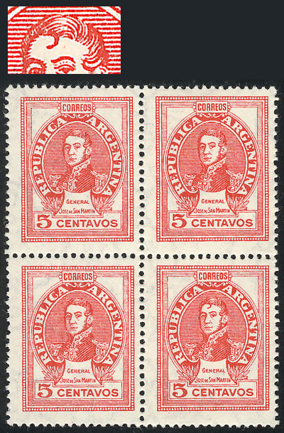 5c. San Martín, block of 4, one with variety: Curl over the forehead, VF quality (Image)