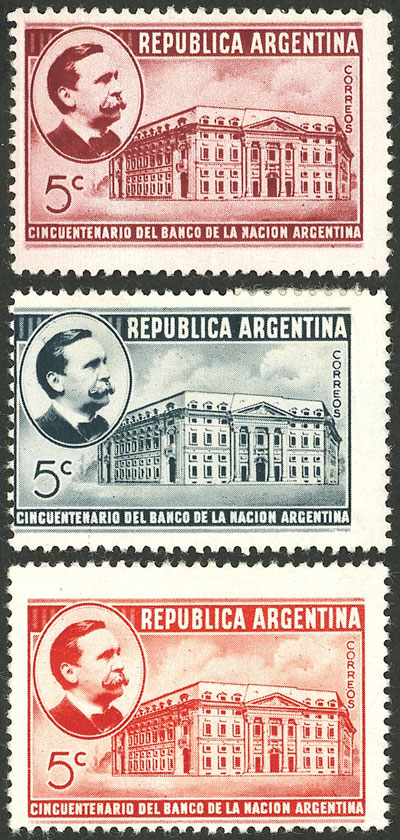 5c. Banco de la Nación Argentina, 3 proofs in different colors, on glazed paper, perforated, VF (Image)