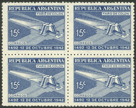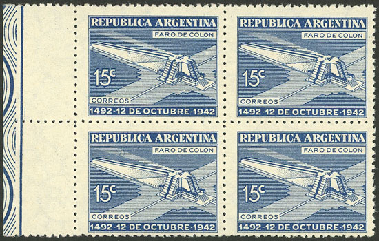 15c. Discovery of America 450 years, round sun wmk, marginal block of 4, VF (Image)
