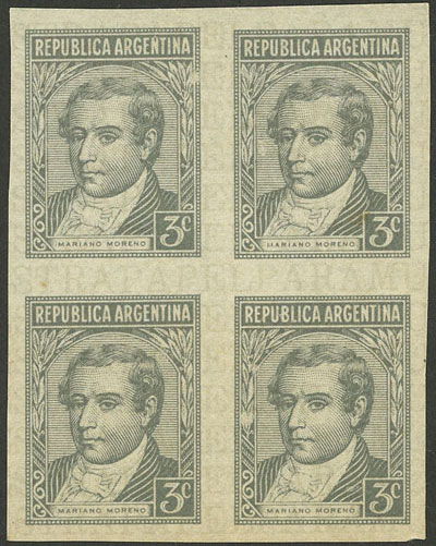 3c. Moreno, proofs in gray, on special paper for specimens, block of 4, VF (Image)