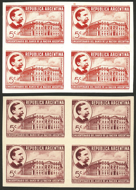 5c. Banco de la Nación Argentina bank, proofs in red and red-chestnut, in blocks of 4, VF (Image)