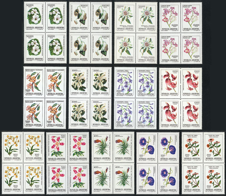 GJ.2025/37, Flowers (in Pesos Ley 18188), cmpl. set of 13 values in blocks of 4, VF quality (Image)