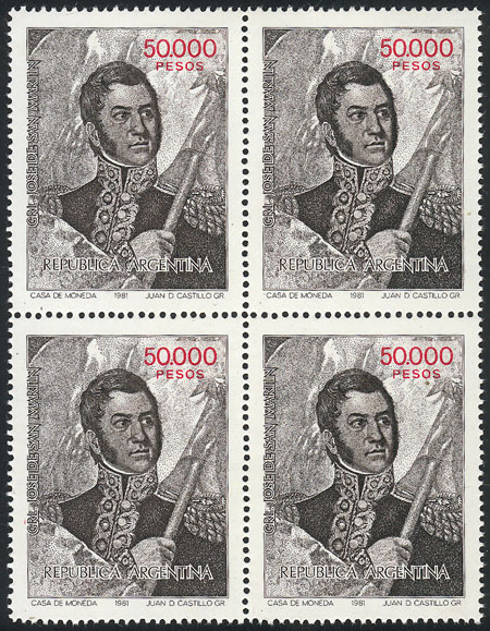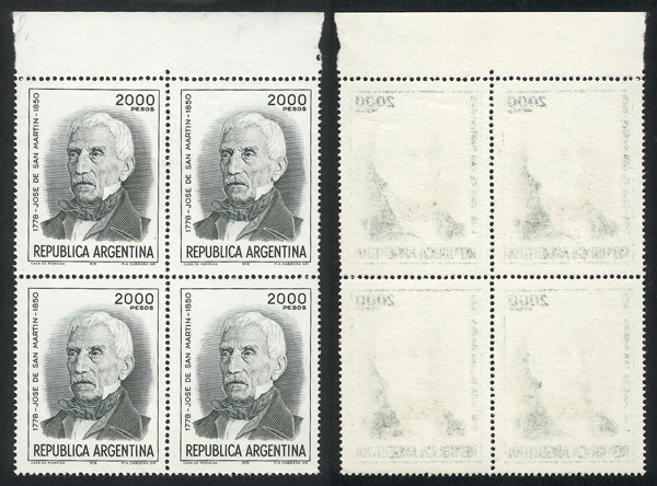 2000P. San Martín, unwatermarked, offset impression on back, marginal block of 4, VF quality (Image)