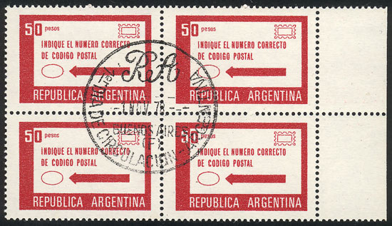 50P. Post Code, block of 4 with first day pmk, VF quality (Image)