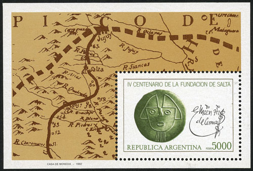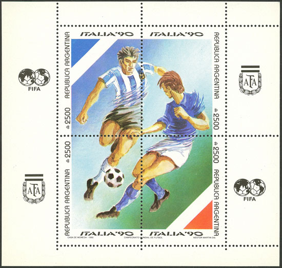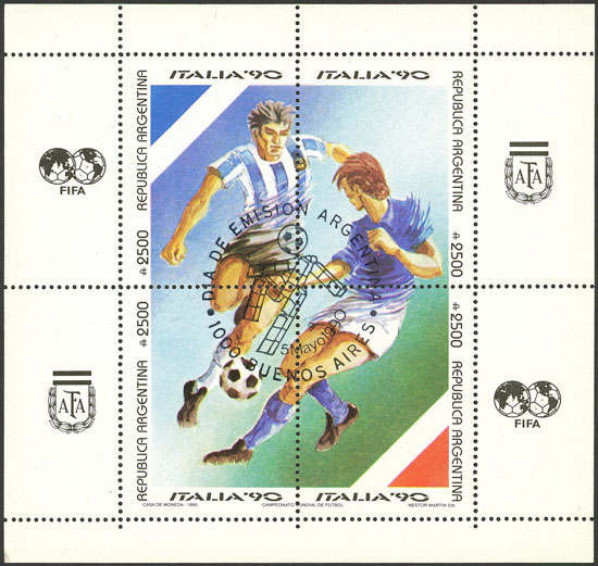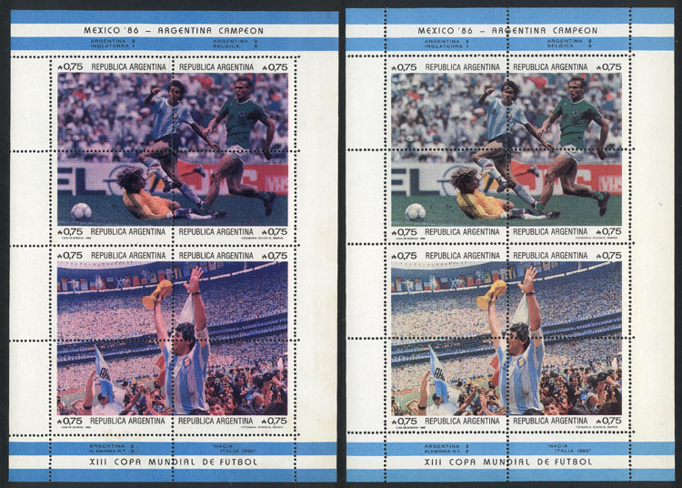 Argentina Champion of the Football World Cup Mexico 1986, with different colors from a normal sheet (one included for comparison), minor stain spots (Image)