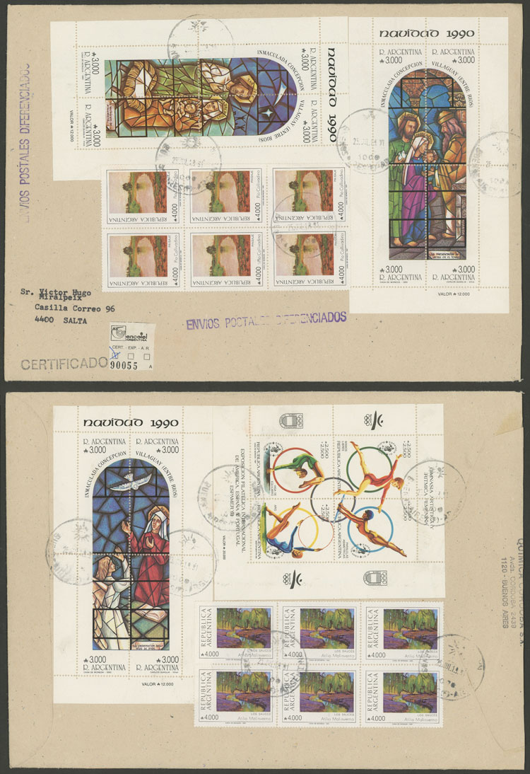 93/5 + 98, Christmas, set of 3 s.sheets + Gymnastics, on registered cover sent from Buenos Aires to Salta on 25/JUL/1991, total postage A94,000, VF quality (Image)