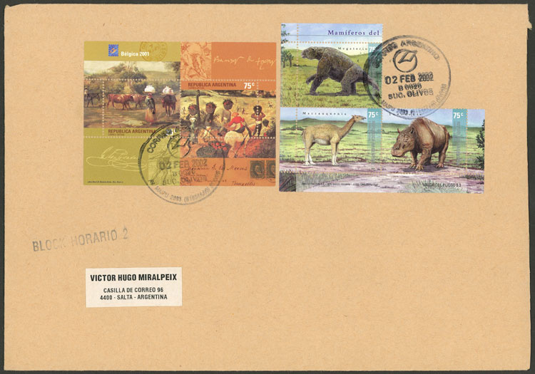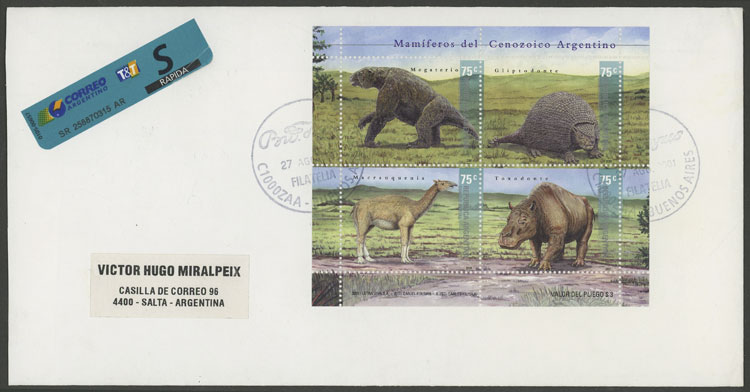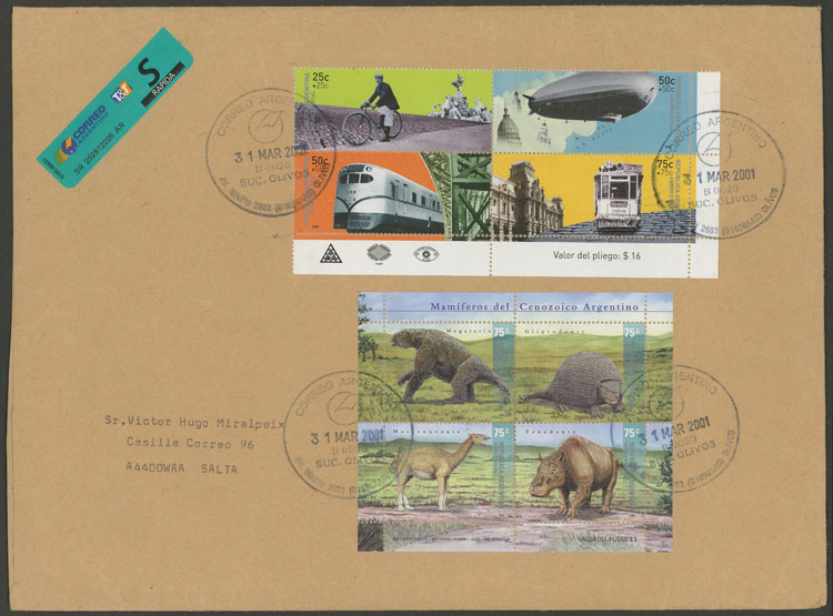 134, Cenozoic mammals, s.sheet on cover sent from Olivos to Salta on 31/MAR/2001, franked with set GJ.3076/9 Means of transport (total $5), VF (Image)