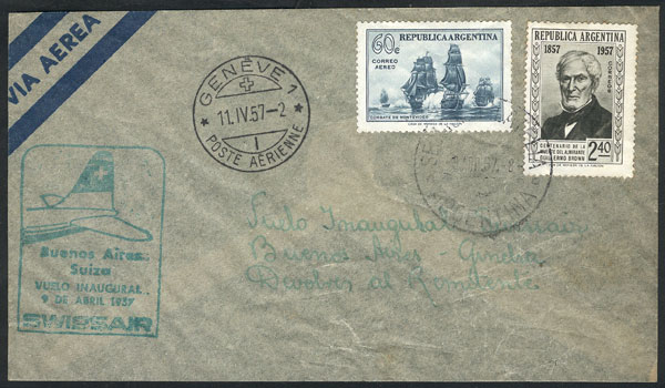 flown on the Buenos Aires - Switzerland first flight by Swiss Air on 11/AP/1957, VF quality (Image)