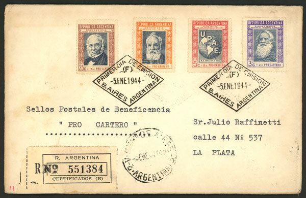 Registered cover sent from Buenos Aires to La Plata on 5/JA/1944, franked with 3+2c, 5+5c, 10+5c and 25+15c. Postal Welfare with first day postmarks, VF quality