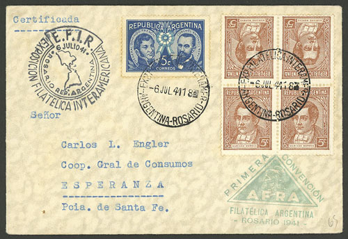 sent from Rosario to Esperanza (Santa Fe) on 6/JUL/1941, franked with 5c. French & Beruti + 5c. Moreno in tete-beche block of 4 on chalky paper, with commemorative pmk, VF quality (Image)
