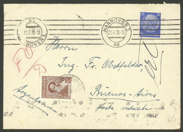 sent from Hannover (Germany) to poste restante in Buenos Aires on 21/JUN/1939, with Argentine stamp to pay for the delivery service, VF quality (Image)