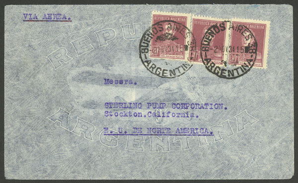 cover from Buenos Aires to Stockton (USA) 2/NO/1934, franked with 3x 30c. San Martín w/o period, VF quality (Image)