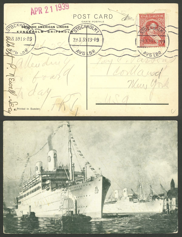 from ship "Kungsholm" to New York, franked with Argentina stamp of 10c. and cancelled in Stockholm on 29/MAR/1939, VF quality (Image)
