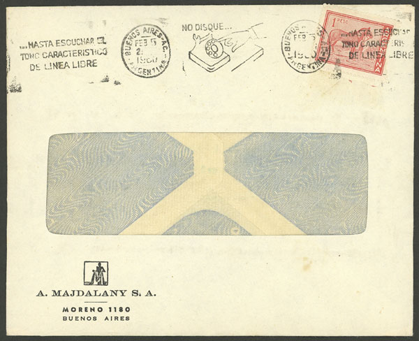 used in Buenos Aires on 2/FE/1960, franked with 1$, with slogan cancel "Do not dial until you hear the characteristic dial tone", VF (Image)