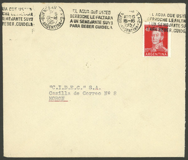 sent from Buenos Aires to Morón on 5/AP/1957, franked with 40c., with slogan cancel "The water that you waste someone else will not have to drink - save it", VF