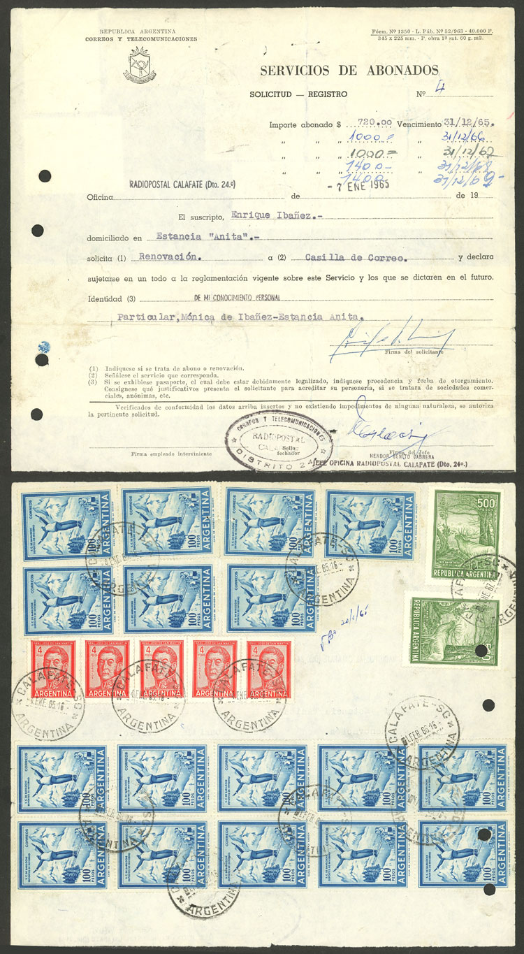 for renewal of a PO box, with postage stamps for 3 payments: 4/JA/1965 $720, 1/FE/1966 $1000 and 7/JA/1967 $1000, with cancel of Calafate (Santa Cruz), VF (Image)