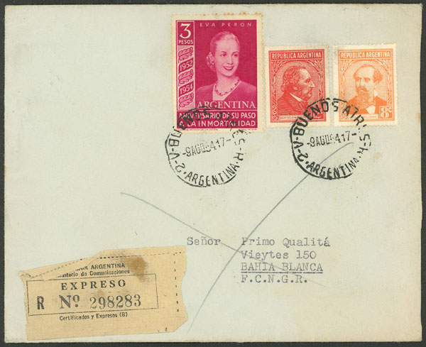 Express cover sent from B.Aires to Bahia Blanca on 9/AU/1947, franked with $3.20 including the 3P. Eva Perón (GJ.1030), VF (Image) (Image-02)