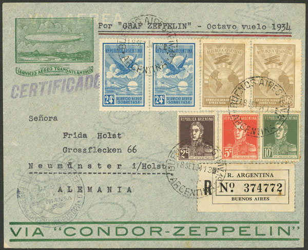 18/SE/1934: Registered airmail cover sent from B.Aires to Germany on Zeppelin's 8th yearly flight, colorful postage of $1.37, with special handstamp and Friedrichshafen arrival, VF (Image)