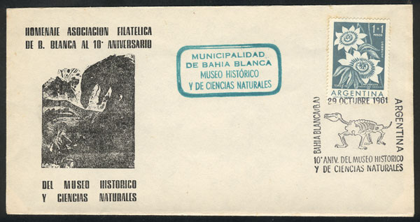 Anniversary of the History and Natural Science Museum of Bahia Blanca, cover with special cancel (dinosaur) of 29/OC/1961, VF quality (Image)