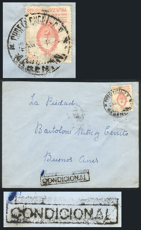 Cover franked with 5c. "Movement of 4 June 1943", sent from CHOELE CHOEL to Buenos Aires on 12/AP/1944, with the "CONDICIONAL" postal mark indicating that there was some kind of problem in the route, VF quality (Image) (Image-02)