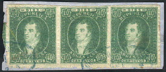 10c. worn impression, beautiful strip of 3 (the left stamp with a small cut) on fragment with Rosario cancel, very nice and attractive! (Image)