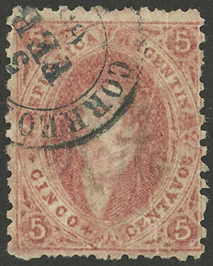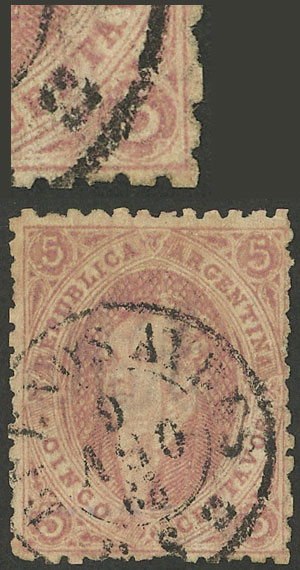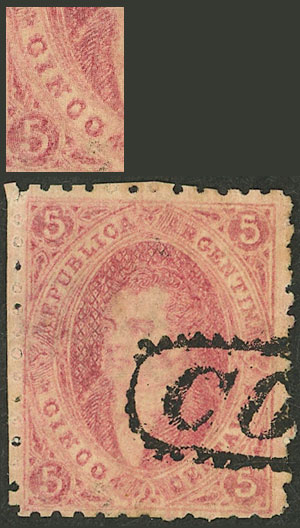 PHILATELIC GEM: GJ.19b, 1st printing with variety: PARTIAL DOUBLE IMPRESSION (clearly seen in the "CINCO"), used in Cordoba, with left sheet margin, absolutely superb! (Image)