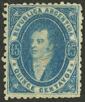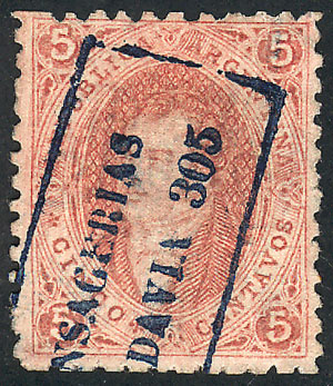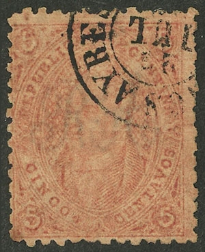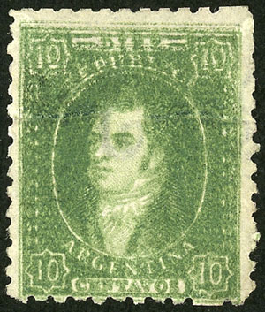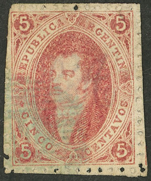 carminish dun-red, 3rd printing, semi-clear impression, with the framed stagecoach mail mark "MENSAGERIAS RIVADAVIA 305", superb and rare! (Image)