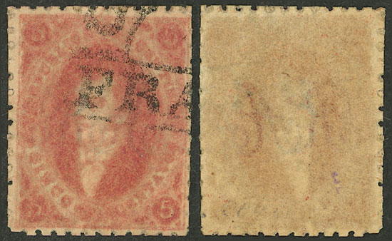 with combined varieties: Very notable partial DOUBLE IMPRESSION (50% of the stamp) + thin paper (90 microns) + lightly parchment-like paper + vertical line watermark (left sheet margin), used in Rosario on 15/NO/1865, superb! (Image)