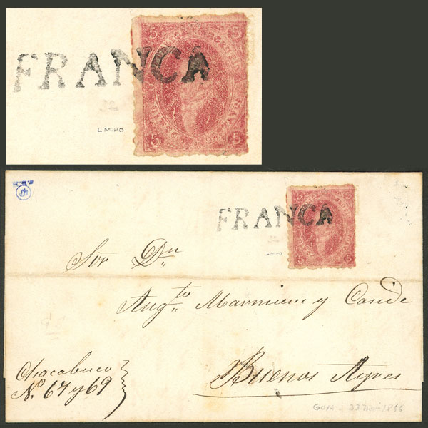 4th printing, franking a folded cover dated 23/NO/1866 and sent to Buenos Aires, with spectacular FRANCA cancel of Goya, excellent quality! (Image)