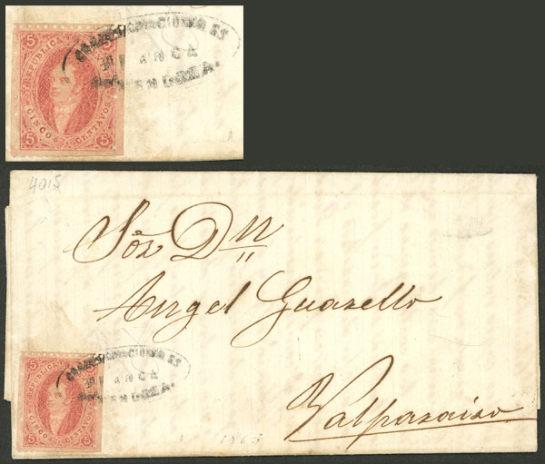 1st printing, clear impression, fantastic example of jumbo size franking an entire letter sent from Mendoza to Valaparaíso on 1/JUN/1865, superb! (Image)