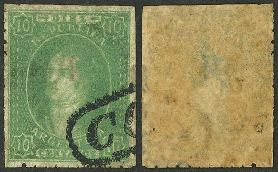3rd printing, printed on PARTCHMENT-LIKE and oily paper, so rare in this printing that Kneitschel did not catalog it, and it will be included in the next edition of the GJ catalog as GJ.20p, used in Córdoba, superb example! (Image)