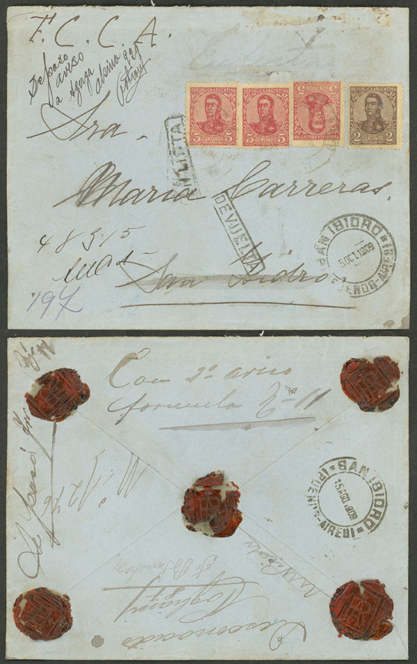 Registered cover sent from Buenos Aires to San Isidro in AU/1909 franked with 17c., and returned to sender on 5/OC after the addressee could not be found after several attempts, with interesting marks and cancels on front and back, very