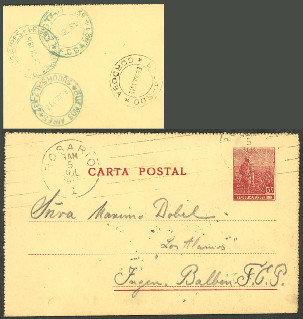 5c. Plowman lettercard sent from Rosario to Estancia Los Álamos in Ingeniero Balbín (north of the province of Buenos Aires) on 5/JUL/1915. It bears a machine cancel of Rosario and on back an interesting combination of ESTAFETAS: "DISTRITO