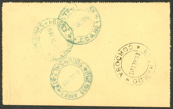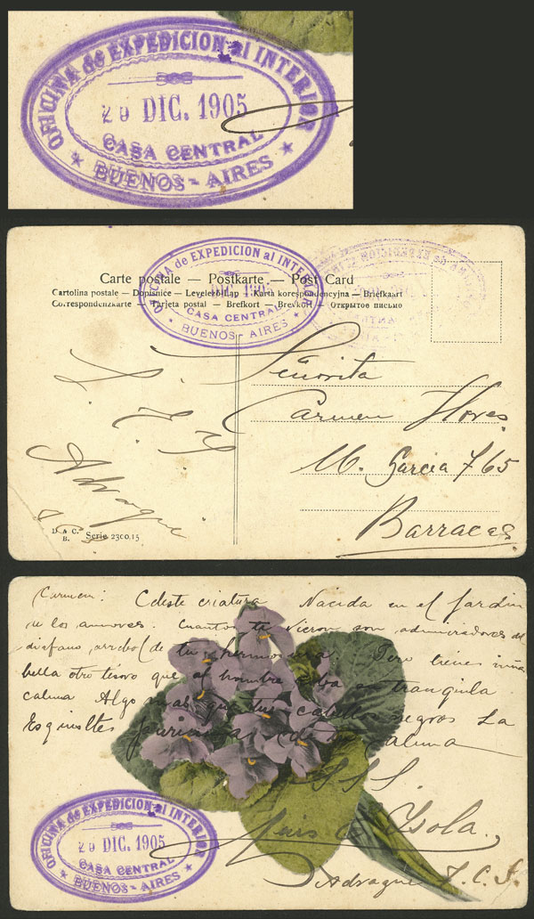 sent from ADROGUÉ to Barracas without postage, with violet marks on front and back: "OFICINA DE EXPEDICIÓN AL INTERIOR - CASA CENTRAL - BUENOS AIRES" for 15/DE/1905, very fine quality, rare! (Image)